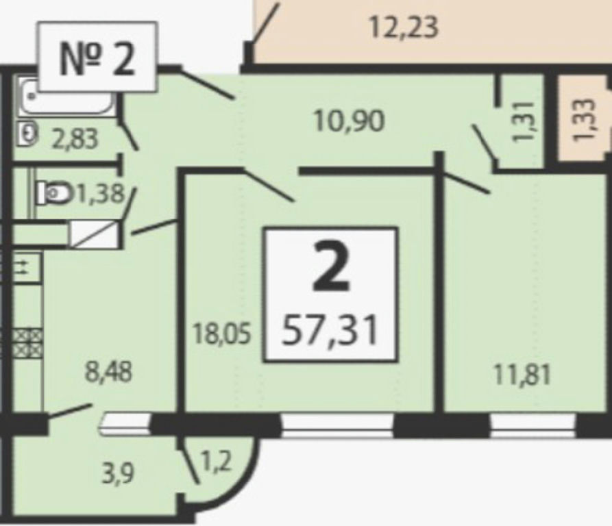 Общая: 57,1 м2