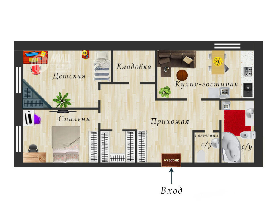 Просторная квартира в современном жилом комплексе "Акварели". Планировка: 2 изолированные комнаты + гостиная, совмещенная с кухней 23 кв.м., КЛАДОВАЯ и ГАРДЕРОБНАЯ, 2 санузла.